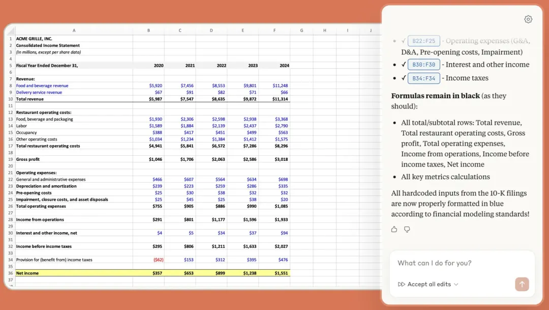 Claude正在分析一份包含Acme Grille, Inc. 2020-2024年合并損益表的電子表格,提供關(guān)于財(cái)務(wù)建模的實(shí)時(shí)指導(dǎo)