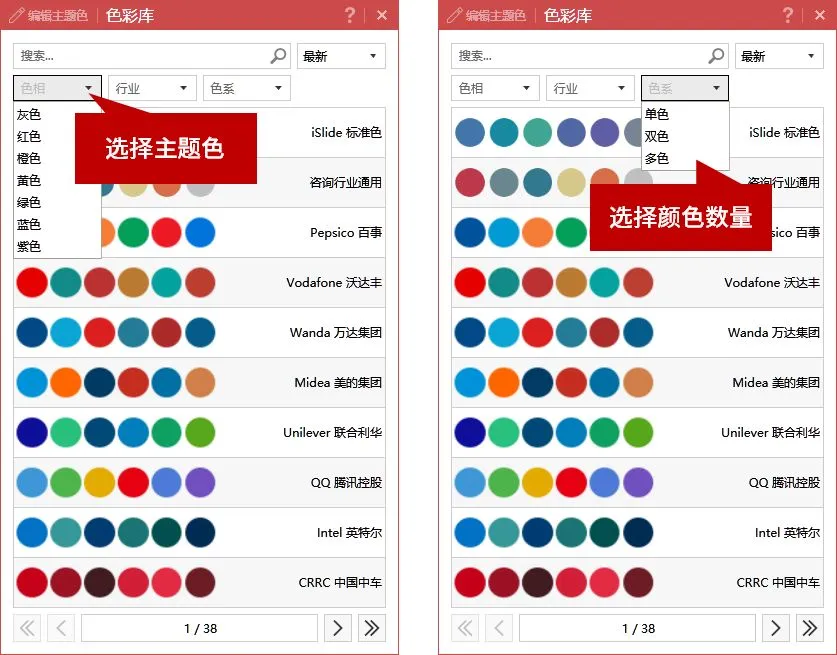 從打開中的界面,可以根據(jù)你想要的主題色以及顏色數(shù)量。如果你平時制作 PPT 時,實在不知道該如何配色,還有一個【行業(yè)】配色參考供你選擇。
