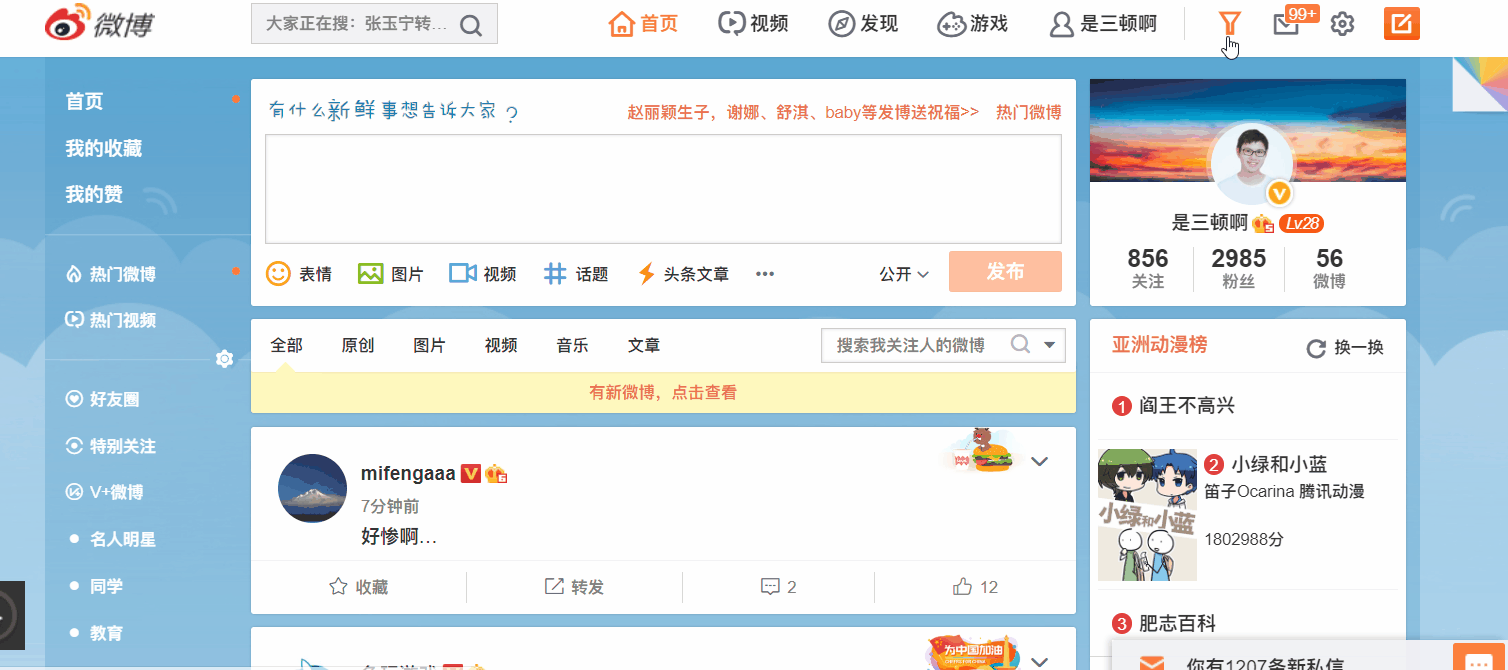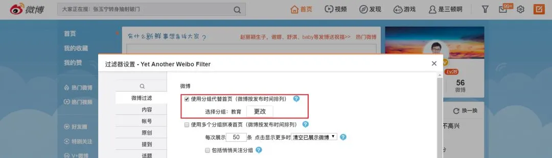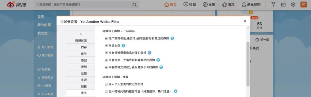 安裝工具后右上角新增的這個(gè)漏斗就是它設(shè)置選項(xiàng)卡,打開后你就會(huì)發(fā)現(xiàn)功能簡(jiǎn)直眼花繚亂,過(guò)濾微博內(nèi)容,清理版面圖標(biāo),修改外觀樣式,微博一切的“不和諧”都能用它改造。