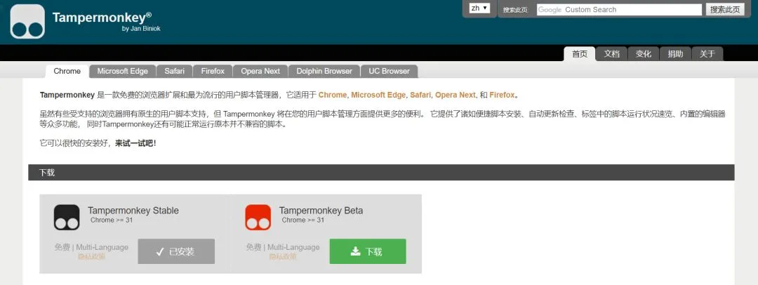 我們可以直接在插件的官網(wǎng)Tampermonkey.net找到對(duì)應(yīng)的瀏覽器版本進(jìn)行安裝,目前支持Chrome、Edge、以及Firefox等主流瀏覽器,