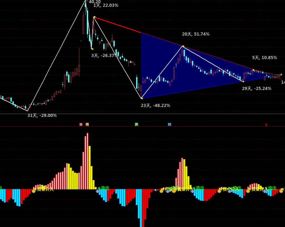 它最基礎(chǔ)的想法,就是把總成交額(AMOUNT),根據(jù)當(dāng)天的價(jià)格走勢(是陽線、陰線還是十字星?),強(qiáng)行分成兩撥:一撥算作“流入”的錢(買盤力量),標(biāo)成刺眼的紅色;另一撥算作“流出”的錢(賣盤壓力),標(biāo)成綠色.這個(gè)分法(LIJIN1的計(jì)算和后續(xù)的IF判斷)是它的基石,它假設(shè)在上漲陽線里,靠近開盤價(jià)和最低價(jià)區(qū)域的成交是主力在吃貨(流入為主);在下跌陰線里,靠近開盤價(jià)和最高價(jià)區(qū)域的成交是主力在出貨(流出為主).十字星嘛,就簡單粗暴對半分.這邏輯吧,有點(diǎn)主觀,但很多類似指標(biāo)都這么干,算是個(gè)約定俗成的套路.