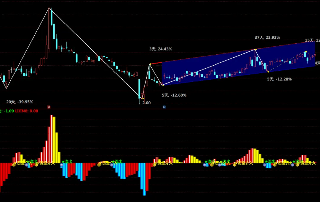 趨勢變化(LIJIN8與昨日比較):最妙的是它還判斷趨勢的“動(dòng)能”變化!當(dāng)LIJIN8是正的(向上力道),但比昨天小了(LIJIN8<REF(LIJIN8,1)),意味著向上的勁兒在衰減,它就用青綠色系的柱子(從深綠到淺綠再到亮綠)來警示.反過來,當(dāng)LIJIN8是負(fù)的(向下力道),但比昨天數(shù)值大(負(fù)得少一點(diǎn)了)或者負(fù)的幅度小了(LIJIN8>REF(LIJIN8,1)),意味著向下的勁兒在減弱,可能跌不動(dòng)了,它就用深藍(lán)到亮藍(lán)的柱子表示.這種對“力道變化速度”的刻畫,比單純看方向深刻多了,能提前嗅到趨勢衰竭或反轉(zhuǎn)的苗頭.