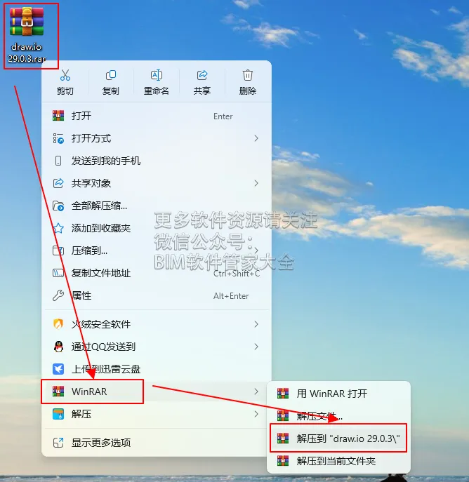 1、鼠標(biāo)右鍵選擇下載的好的安裝包【免費流程圖制作工具draw.io v29.0.3】,然后選擇【解壓到“免費流程圖制作工具draw.io v29.0.3”】進行解壓。(下載軟件安裝包之前務(wù)必將殺毒軟件以及防火墻關(guān)閉,避免將破解補丁或注冊機刪除)