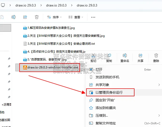 3、打開剛剛解壓的文件夾,鼠標(biāo)右鍵點擊“draw.io-29.0.3-windows-installer.exe”選擇“以管理員身份運行”。