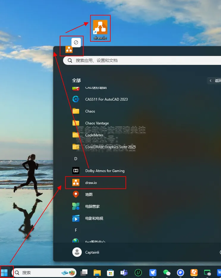 7、點擊“開始“菜單欄,點擊“所有應(yīng)用“,找到“draw.io“軟件,鼠標(biāo)左鍵拖拽到桌面上即可創(chuàng)建桌面快捷方式