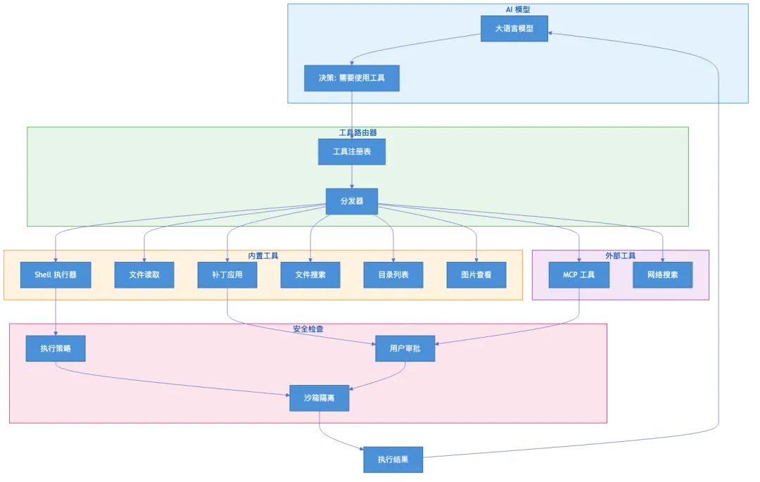 1. AI 決定使用工具? ?└── "我需要運行測試來驗證修復(fù)"2. 生成工具調(diào)用? ?└── { tool: "shell", command: "npm test" }3. 權(quán)限檢查? ?└── 檢查執(zhí)行策略和沙箱規(guī)則4. 執(zhí)行工具? ?└── 在沙箱中運行命令5. 返回結(jié)果? ?└── 將輸出返回給 AI6. AI 繼續(xù)推理? ?└── "測試通過了,修復(fù)成功!"