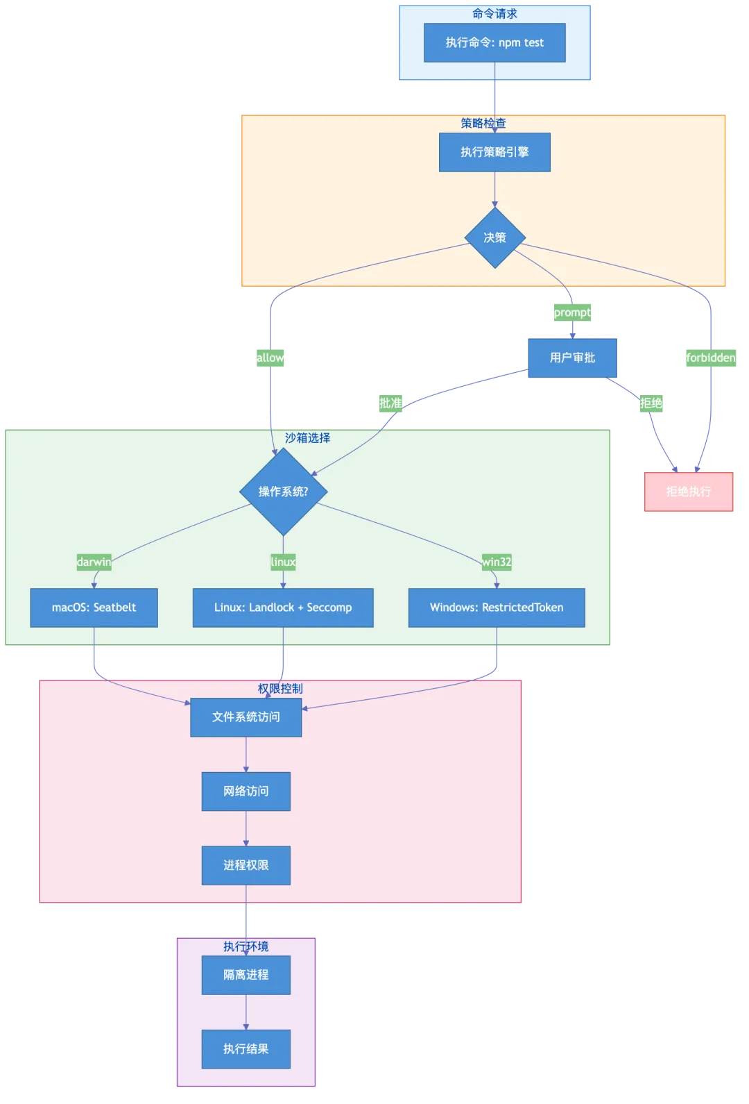 1. AI 請求執(zhí)行需要額外權(quán)限的命令2. 向用戶顯示權(quán)限提升請求3. 用戶確認(rèn)后,在沙箱外執(zhí)行4. 記錄操作日志