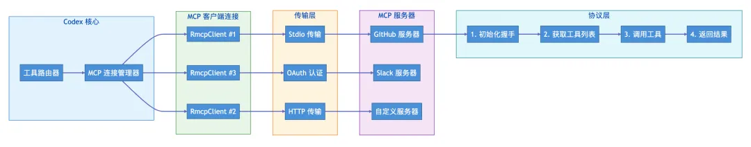 ┌─────────────┐ ? ? JSON-RPC ? ? ?┌─────────────┐│ ? Codex ? ? │ ?──────────────? │ ?MCP 服務(wù)器 ?││ ?(客戶端) ? │ ? ?over stdio ? ?│ ?(GitHub) ? │└─────────────┘ ? ? ? ? ? ? ? ? ? └─────────────┘1. 初始化握手:交換能力聲明2. 工具列表:獲取可用工具3. 工具調(diào)用:執(zhí)行具體操作4. 返回結(jié)果:獲取執(zhí)行結(jié)果