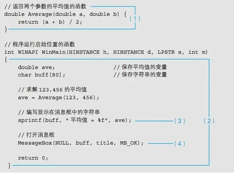 首先,請(qǐng)大家看一下代碼清單 8-1。這是一個(gè)用 C 語(yǔ)言記述的 Windows 程序。該程序運(yùn)行后,會(huì)把 123 和 456 的平均值 289.5 顯示在 消息框