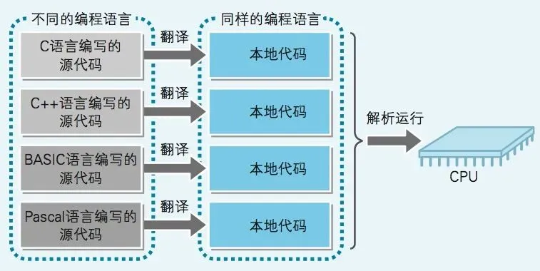 即使是用不同編程語(yǔ)言編寫的代碼,轉(zhuǎn)換成本地 代碼后,也都變成用同一種語(yǔ)言(機(jī)器語(yǔ)言)來(lái)表示了。