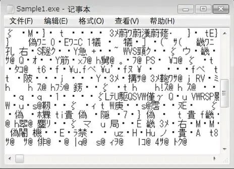 用記事本打開(kāi)由代碼清單的內(nèi)容轉(zhuǎn)換成本地代碼得到的 EXE 文件(Sample1.exe),頁(yè)面顯示情況如圖所示。