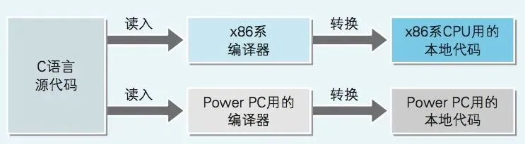 根據(jù) CPU 類型的不同,本地代碼的類型也不同。因而,編譯器不僅和編程語(yǔ)言的種類有關(guān),和 CPU 的類型也是相關(guān)的。