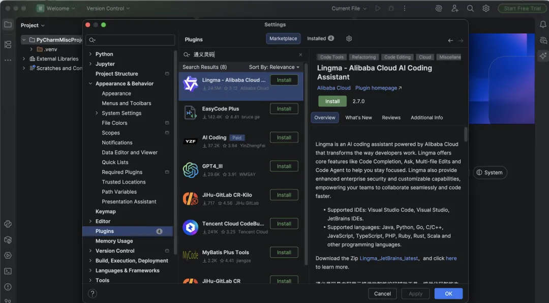 通過Settings —> Plugins,搜索 “通義靈碼”,安裝即可。