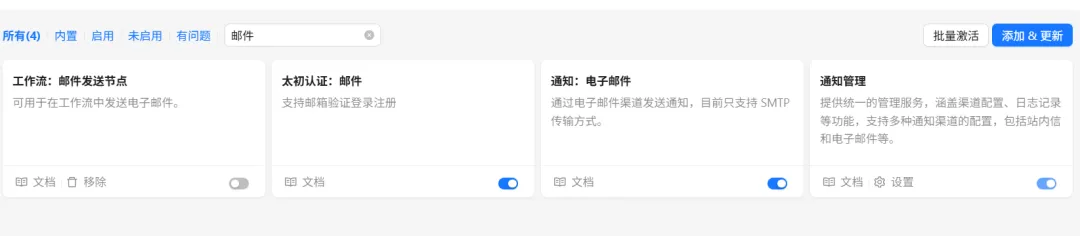 下面這個(gè)郵件通知插件,nocobase社區(qū)版是默認(rèn)是不開啟,需要手動(dòng)到插件管理中開啟,開啟在之后你就可以在新建郵件通知渠道: