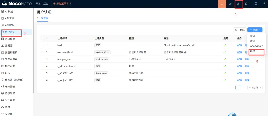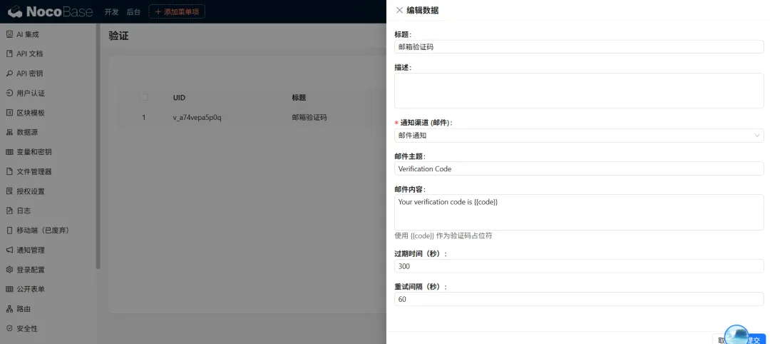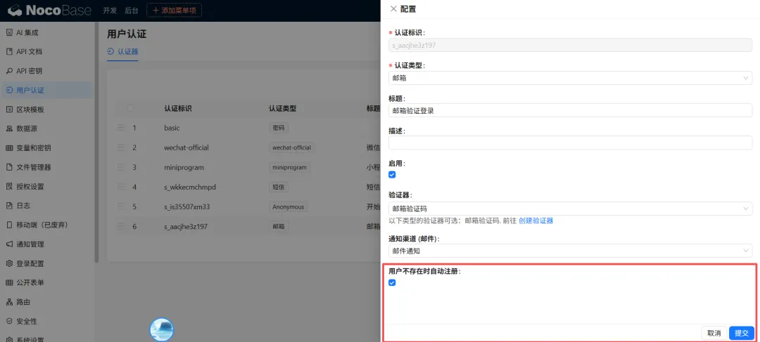 自己開發(fā)了nocobase插件,一個(gè)郵件發(fā)送驗(yàn)證碼,開啟插件,nocobase 支持郵箱發(fā)送驗(yàn)證碼,進(jìn)行注冊(cè)登錄認(rèn)證。每一次登錄都要發(fā)送驗(yàn)證碼,如果開放注冊(cè),那么首次登錄自動(dòng)注冊(cè)。